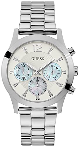 GUESS - ساعة من جيس للنساء، بمينا لؤلؤية وسوار فضي، مع ميزة الكرونوغراف