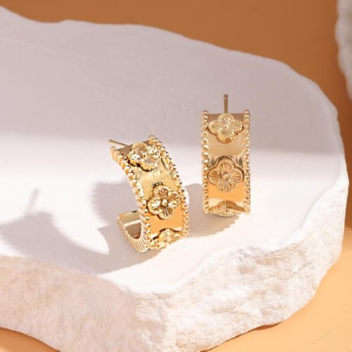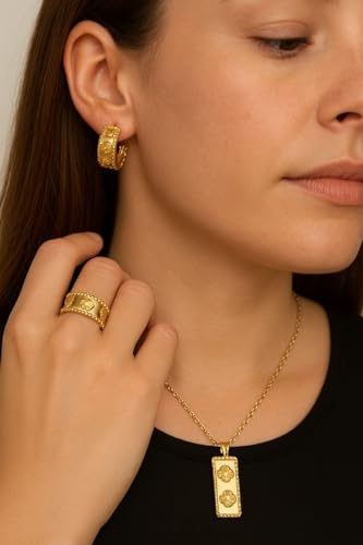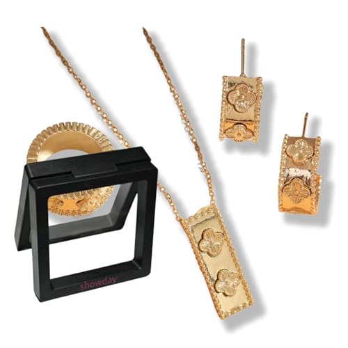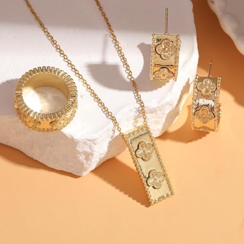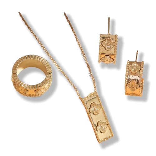 GuLiNiao - طقم مجوهرات برسيم فاخر 3 قطع (قلادة، أقراط، خاتم) – نحاس مطلي ذهب 18 قيراط – تصميم مينيمالي أنيق للنساء – هدية مثالية مع علبة فاخرة