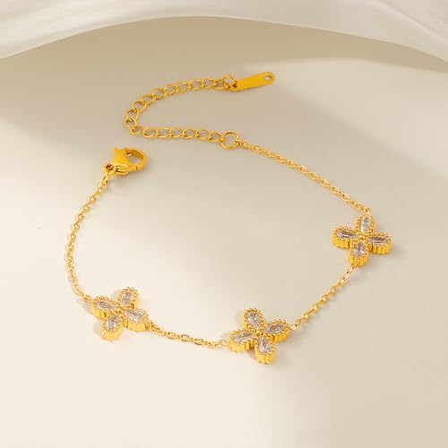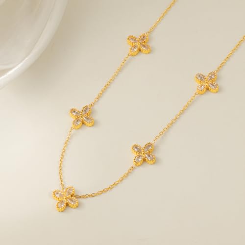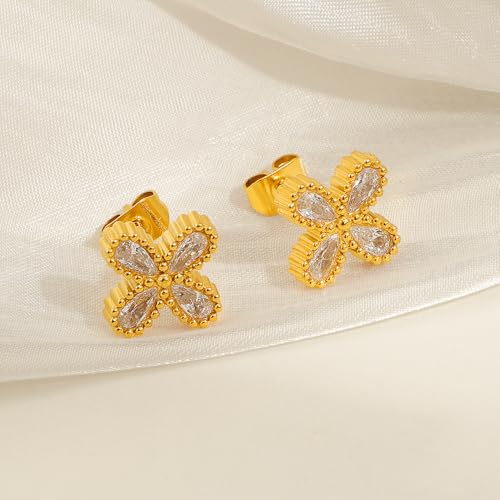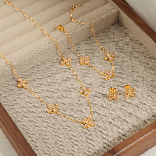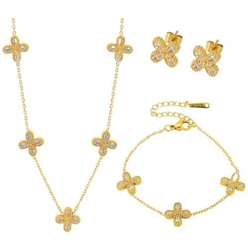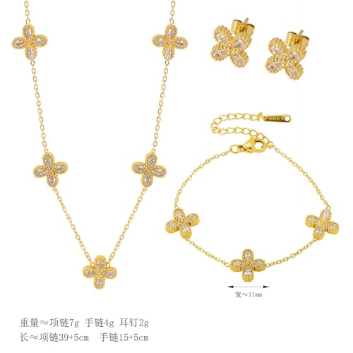 GuLiNiao - طقم مجوهرات "زهرة الحظ" رباعية البتلات مطلي بالذهب عقد+ سوار+ أقراط ستانلس ستيل مرصعة بزركون فائق اللمعان، لتألّق أسطوري يأسر القلوب في كل مناسبة