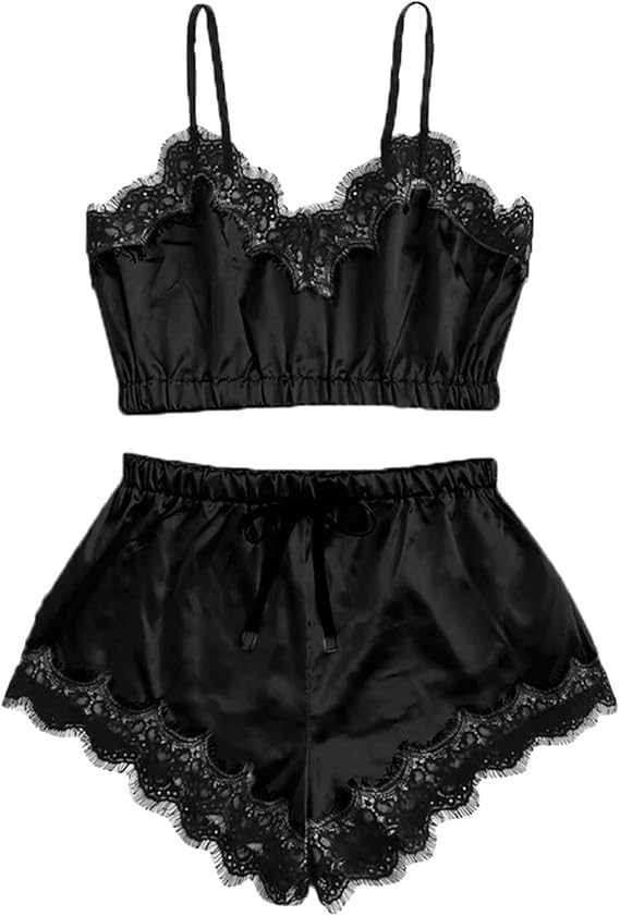 GuLiNiao - طقم بيجامة حريري دانتيل نسائي قطعتين (توب + شورت) | تصميم ناعم وأنيق للنوم والاسترخاء – قماش ساتان فخم ولمسة دانتيل جذابة (اسود-C, L)