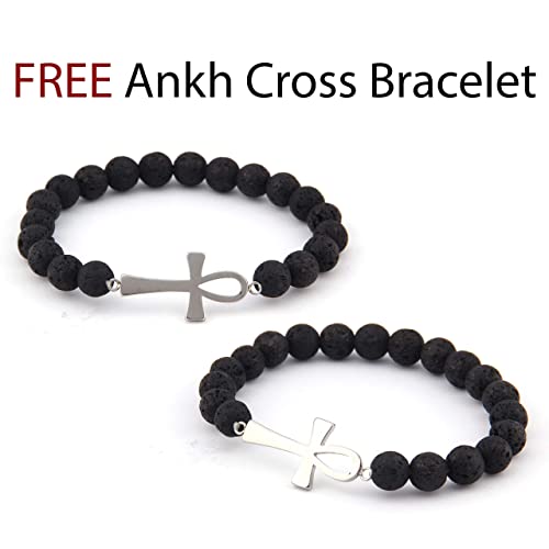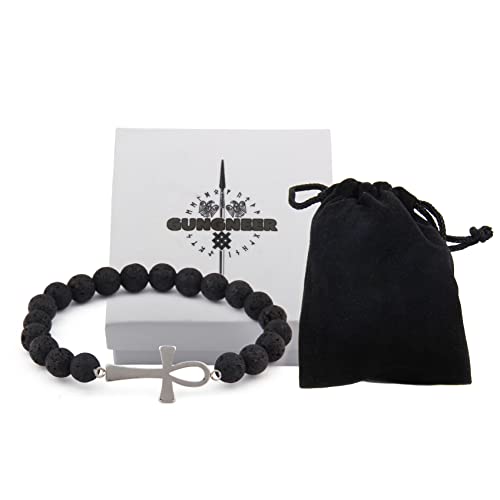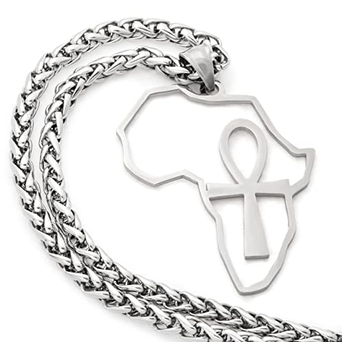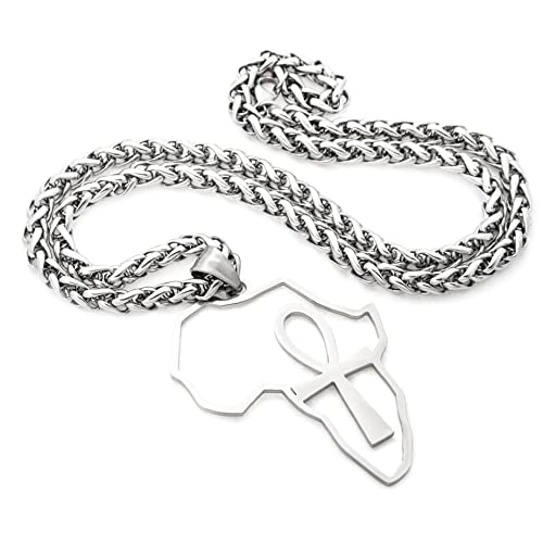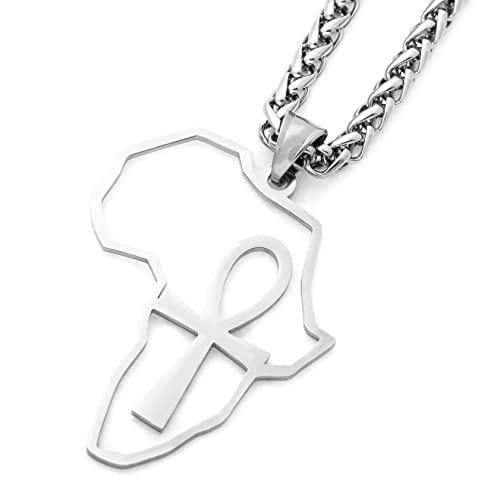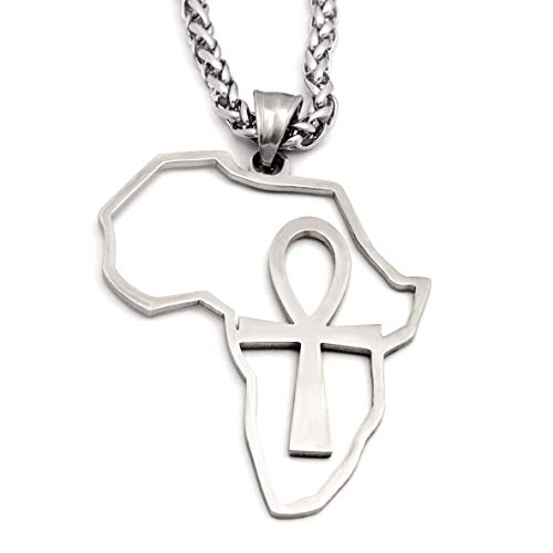 Gungneer - غونجنير قلادة عنخ على شكل صليب من الستانلس ستيل بدلاية على شكل خريطة افريقيا بلون فضي، سلسلة مجوهرات القوة تميمة تميمة