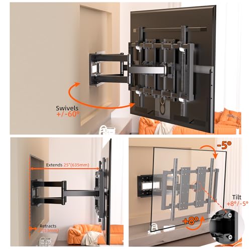- مرونة عالية، حركة كاملة، راحة في الاستخدام: حامل تلفزيون جداري متحرك فائق النحافة قابل للتعديل بالكامل لتوفير زاوية مشاهدة مريحة وتجربة مشاهدة عالية الجودة. يدور ±60° بدون أدوات، يميل +8°/-5° لتقليل الانعكاسات، تعديل مستوى ±3°. يمتد حتى 63.5 سم ويتراجع حتى 5 سم.
