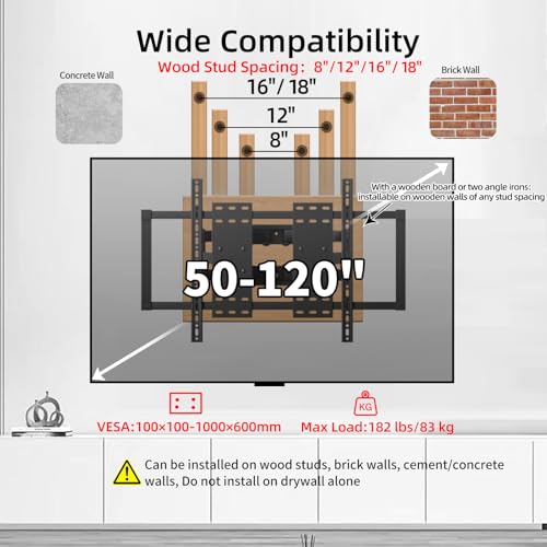 - توافق على نطاق واسع: حامل تلفزيون جداري عالمي مصمم خصيصًا ليتناسب مع الشاشات المسطحة والمنحنية من 50 حتى 120 بوصة، يتحمل حتى 82.5 كجم، متوافق مع معايير فيسا من 100×100 ملم حتى 1000×600 ملم.
