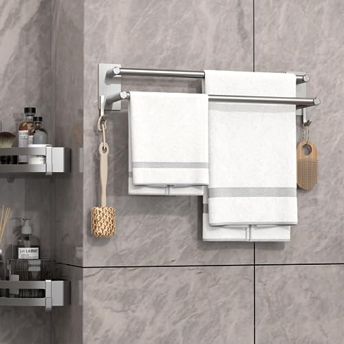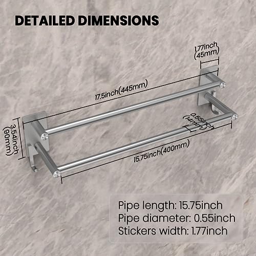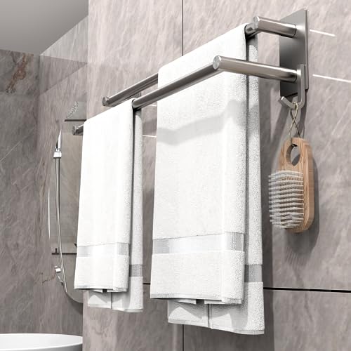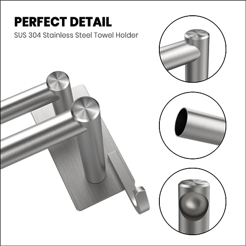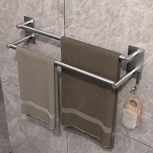 GVKAR - حامل فوط ذاتي اللصق من الفولاذ المقاوم للصدأ SUS 304 مع خطافين للمطبخ والحمام مقاس 44 سم، حامل فوط من طبقتين يثبت على الحائط بقضيبين بلون مطفي ورفوف تخزين من جي في كار