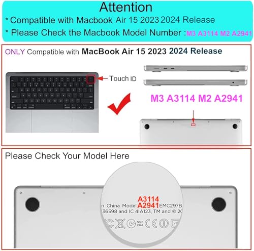 - تتوافق فقط مع ماك بوك اير 15 بوصة بشريحة M2 مع شاشة ليكويد ريتينا وتاتش اي دي إصدار 2023 (الموديل: A2941 - MQKR3LL/A, MQKW3LL/A, MQKP3LL/A, MQKU3LL/A, MQKT3LL/A, MQKX3LL/A, MQKQ3LL/A, MQKV3LL/A). تحذير: هذا الجراب غير متوافق مع موديلات أجهزة اللاب توب الأخرى.