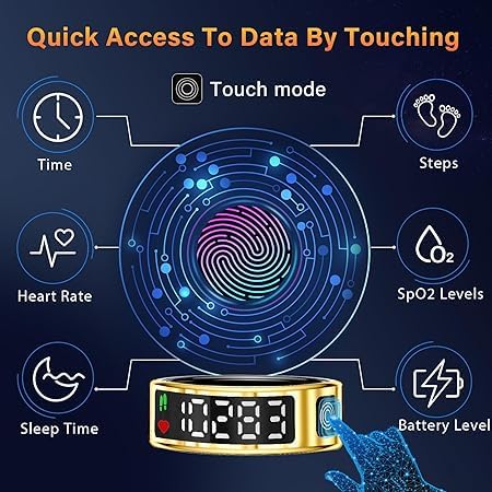 - شاشة ال او دي متعددة الوظائف وزر لمس: اختبر إدارة الأجهزة بسلاسة مع شاشة ال اي دي عالية الوضوح وتحكم سهل باللمس. وبلمسة بسيطة، يمكنك متابعة البيانات الأساسية مثل الوقت وعدد الخطوات ومعدل ضربات القلب ونسبة الأكسجين في الدم والنوم والبطارية بسهولة بدون الحاجة لإخراج موبايلك باستمرار. فقد صُمم خاتمنا الذكي للنساء من أجل راحة تامة، وهو مناسب للعمل واللياقة والترفيه، مما يجعل إدارة الوقت سهلة وبسيطة.