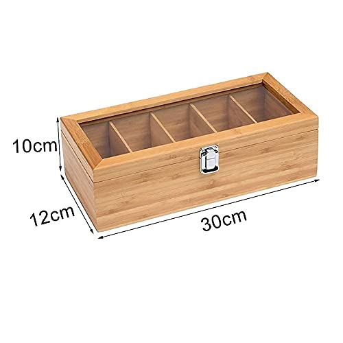 - صندوق شاي مصنوع من الخيزران الصديق للبيئة بمظهر خشبي، 5 مساحات تخزين لكل منها تقريبًا. عبوة من 15 كيس شاي مع غطاء نافذة أكريليك وأبعاد الصندوق: 30 سم × 12 سم × 10 سم.