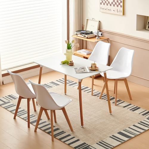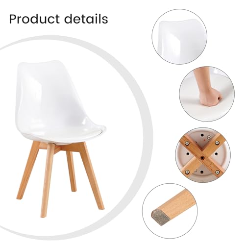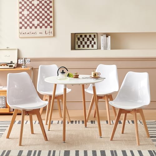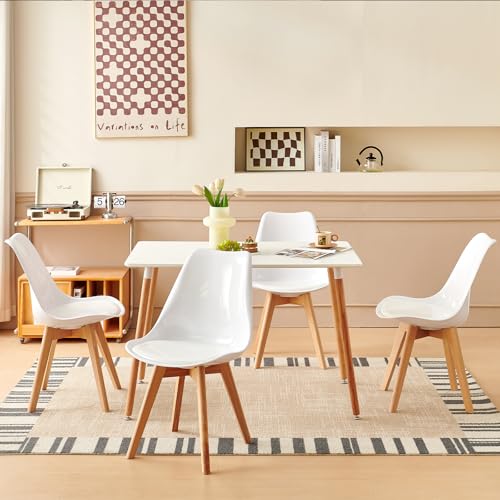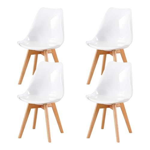 H.J WeDoo - مجموعة من 4 كراسي طعام اسكندنافية مع أرجل خشب الزان اتش.جي ويدو مطبخ عصرية وسادة مقعد منجدة مصقولة مادة البولي يوريثين أبيض لامع