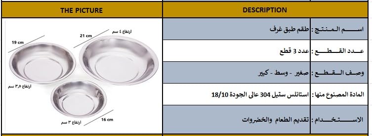Home and Kitchen Art - طقم اطباق غرف 3 مقاسات(مقاس 16 عرض 3 ارتفاع - 19 عرض 3.5 ارتفاع - 21 عرض 4 ارتفاع) ستانلس ستيل H&k Art