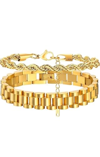 Generic - اساور ذهبية قابلة للتكديس للنساء من هجات بنات ستور - قطعتين (سوار ساعة رولكس ذهبي وسوار مضفر) - ستانلس ستيل مطلي بالذهب عيار 18 قيراط - زركونيا مكعب - للبالغين من الجنسين