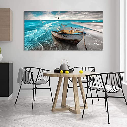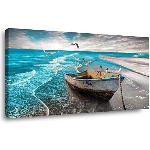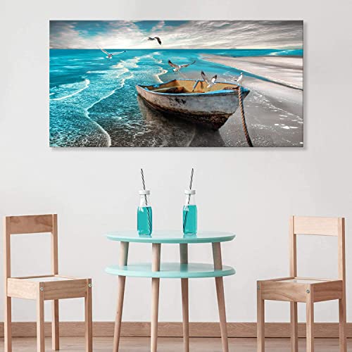 Haichuang Decor Art - لوحة فنية جدارية قماشية مطبوعة باللون الأسود والأبيض للبحر والأمواج لديكور المنزل لمناظر القارب وطيور النورس والمحيط لغرفة المعيشة وغرفة النوم والحمام مقاس 50 × 100 سم من فن ديكور هايشوانج