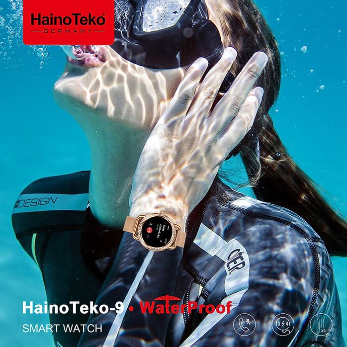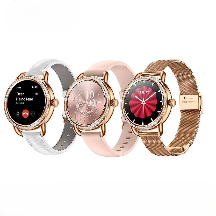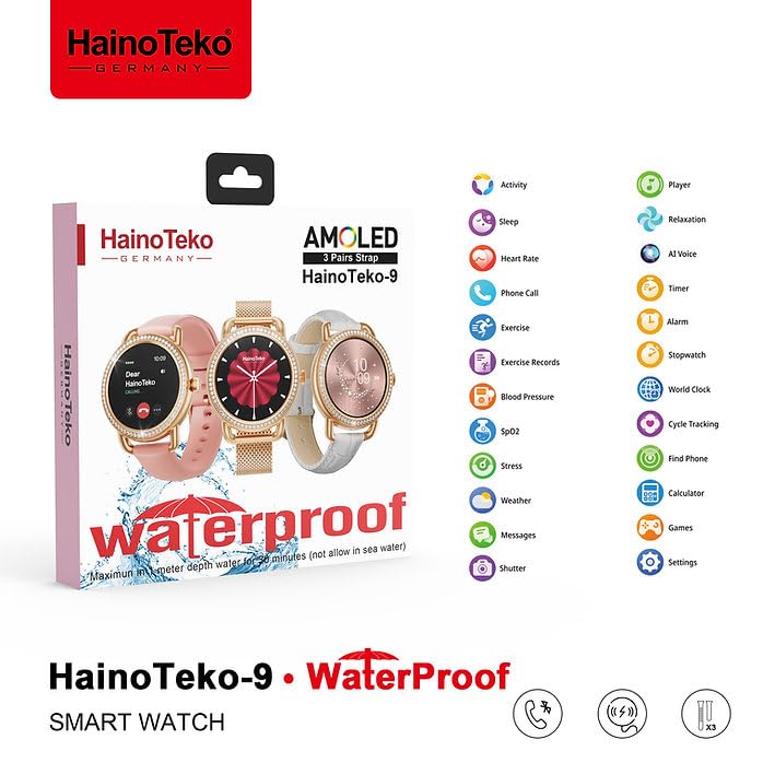 HainoTeko Germany - ساعة ذكية سلسلة 9 من هاينوتيكو، شاشة اموليد، مقاومة للماء، ذهبي وردي مع 3 اساور قابلة للتبديل، تتبع النشاط، مراقب صحة للنساء والرجال