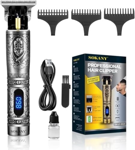 Sokany - ماكينة حلاقة وتشذيب شعر طراز SK-LF-9925 قابلة للاستخدام لاسلكي أو بسلك مزودة بشفرة T لتشذيب دقيق لللحية من صلب الكربون مع شاشة ال سي دي وتصميم بنقوش ريترو للرجال