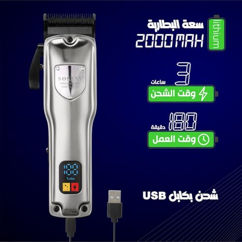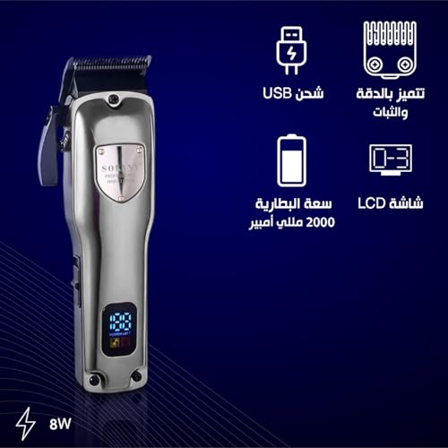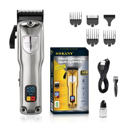 SOKANY - ماكينة حلاقة وتشذيب الشعر، شفرات من الفولاذ المقاوم للصدأ، 4 أمشاط، شاشة LCD، وقت تشغيل 180 دقيقة، طقم تشذيب دقيق، محرك بقوة 8 وات، موديل SK-16049 (لون فضي)
