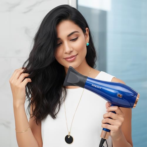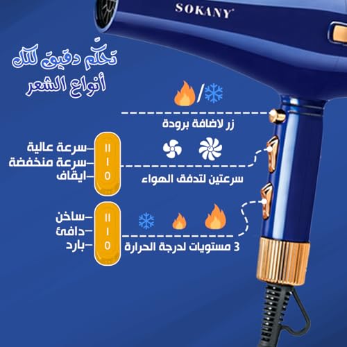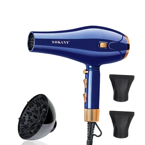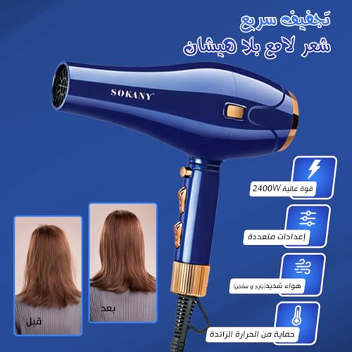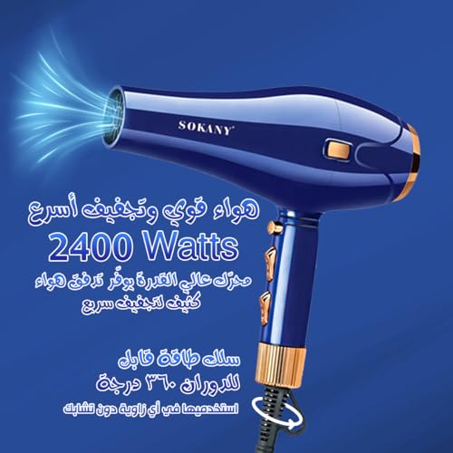 Sokany - مجفف شعر ايوني 2400 واط - سريع الجفاف بالهواء البارد والساخن، سرعتين واعدادين للحرارة، فوهة موزع ومكثف، حماية من الحرارة الزائدة، SK-14003 (ازرق)
