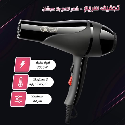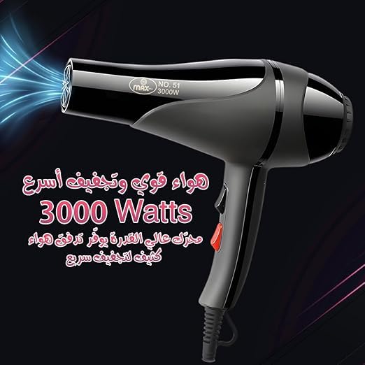 Generic - مجفف شعر احترافي لصالونات التجميل 3000 وات مع فوهة مشط وسرعتين و3 إعدادات للحرارة وضوضاء منخفضة ومكثف هواء قابل للفصل وحماية من الحرارة الزائدة، طراز Max-51
