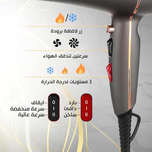 - تجفيف سريع: بفضل قوته العالية، يوفر المجفف أداء تجفيف فائق السرعة لتجفيف الشعر بسرعة وفعالية.