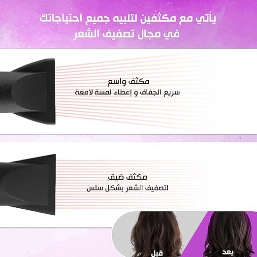 - حماية من الحرارة الزائدة من أجل السلامة: ميزات أمان مدمجة تمنع ارتفاع درجة الحرارة مما يضمن تجربة تجفيف آمنة وخالية من القلق.