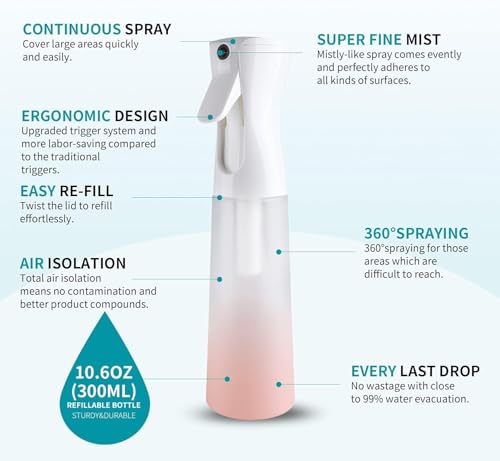 - 【زجاجات بخاخ شعر بزاوية 360 درجة】: تسمح زجاجة الرش المستمر بالرش بزاوية 360 درجة للمناطق التي يصعب الوصول إليها. يمكنك حتى استخدامه جانبيًا ورأسًا على عقب دون تسرب أو فقدان برايم، وبالتالي يمكن الوصول إلى جميع المناطق، حتى تتمكن من استخدام آخر قطرة من السائل.
