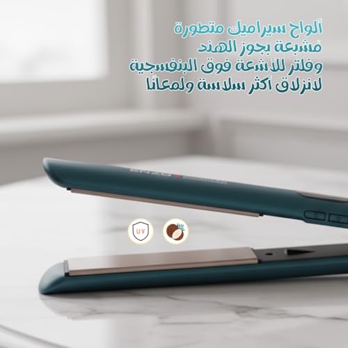 - نتائج بجودة صالونات التجميل في المنزل: استمتعي بلمعان ونعومة صالون التجميل الاحترافي مباشرة من طاولة الزينة الخاصة بك. تحمي ألواح السيراميك الغنية بزيت جوز الهند وفلاتر الأشعة فوق البنفسجية شعرك من الجفاف والتلف الناتج عن الحرارة مع تركه لامعًا.