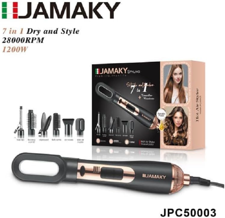 Generic - فرشاة تصفيف الشعر 7 فى 1 متوافق مع جامكى 1200 وات متعددة الاستخدام شاملة بجميع ملحقات الشغر تعمل على تجفيف وفرد الشعربسهولة لعمل افضل التسريحات عالية الجودة - 1200.0 واط اسود