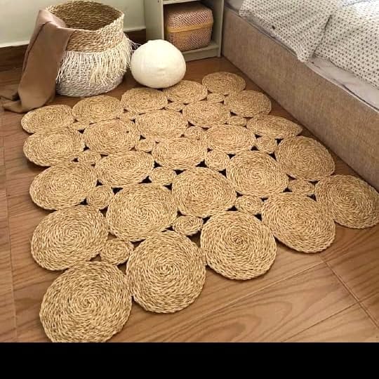 - مواد طبيعية: ألياف الجوت الفاخرة المنسوجة في أقراص حلزونية دائرية مميزة، مما يوفر المتانة والسحر الريفي مع إضافة ملمس إلى أرضيتك