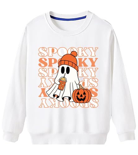 Generic - سويت شيرت ابيض هالوين شبح من مزيج القطن، طباعة اليقطين مخيفة، كم طويل مقاس (S)