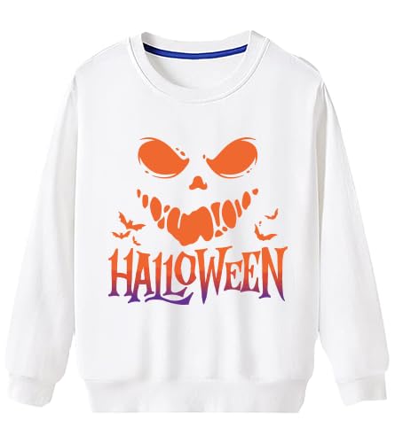 Generic - سويت شيرت ابيض مطبوع عليه رسومات الهالوين، مزيج من القطن، كم طويل، تصميم اليقطين المخيف، مقاس (L)