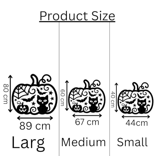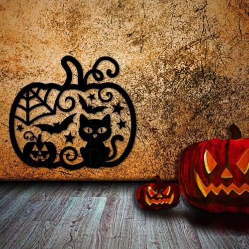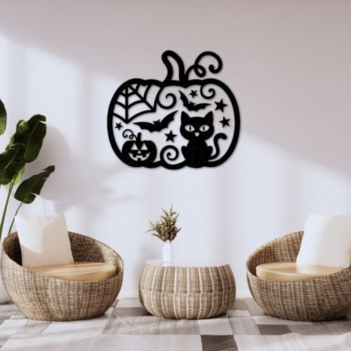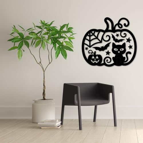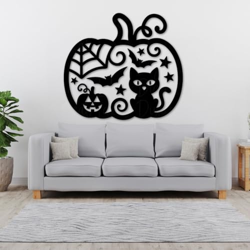 Generic - لوحة فنية جدارية معدنية على شكل يقطين للهالوين، اسود، 3 احجام مزخرفة بتصميم خفاش للقطط للاستخدام الداخلي والمنزل (مقاس L)