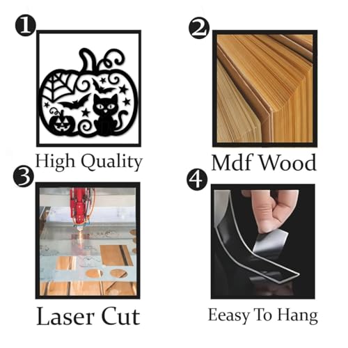 - عناصر التصميم: تتميز بلوحة فنية جدارية معدنية معقدة بطابع الهالوين مع صور ظلية سوداء للقطط والخفافيش والنجوم وفانوس جاك او في إطار يقطين أنيق