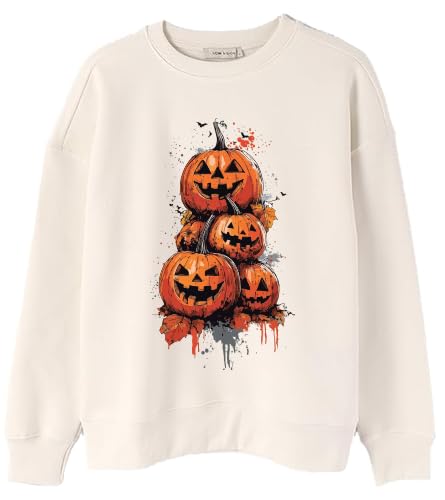 Generic - سويت شيرت برقبة دائرية ضيقة مطبوع عليه صورة اليقطين للهالوين بلون بيج من مزيج القطن، تصميم جاك اولانترن، مقاس (2XL)