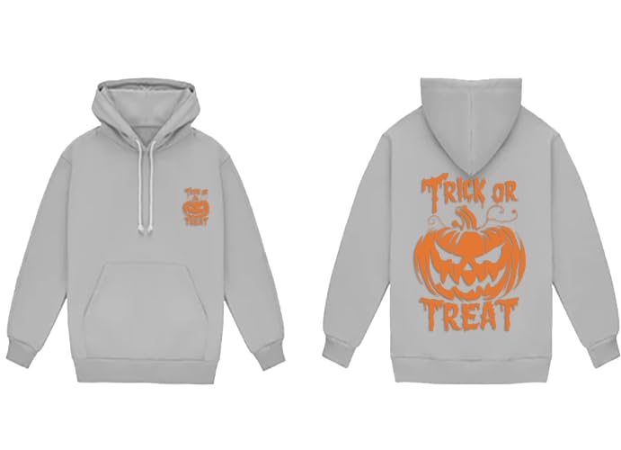 Generic - سويت شيرت بغطاء للراس برسومات اليقطين للهالوين، بلوفر رمادي بتصميم خدعة أو حلوى، جيب أمامي (مقاس ميديوم M)