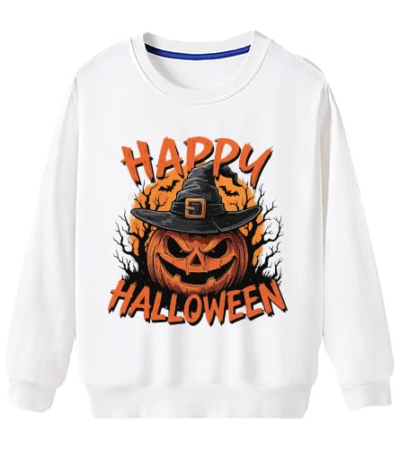 Generic - سويت شيرت أبيض بطبعة جرافيك على شكل يقطينة ساحرة للهالوين من مزيج قطن بأكمام طويلة متوفر بمقاسات مختلفة، مقاس (3-6 سنوات)