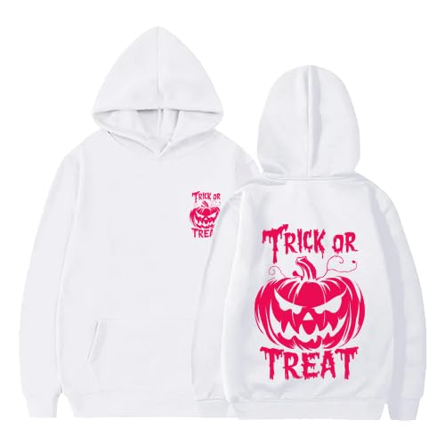 Generic - سويت شيرت بغطاء للراس مطبوع عليه عبارة «Trick or Treat» للهالوين، ابيض مع رسومات وردية، كم طويل (9-12 سنة)