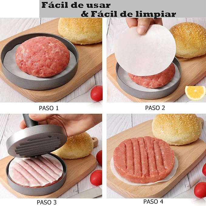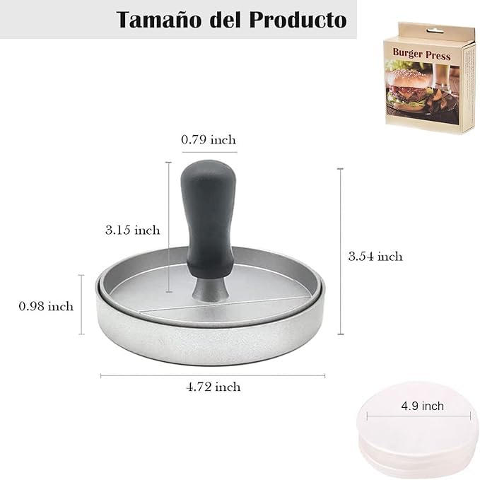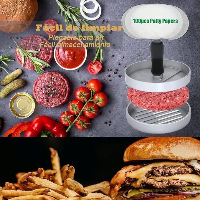 - هيكل متين: مكبس برجر من الألومنيوم شديد التحمل مع طلاء غير لاصق يضمن سهولة إخراج الفطائر وتنظيف خالٍ من المتاعب