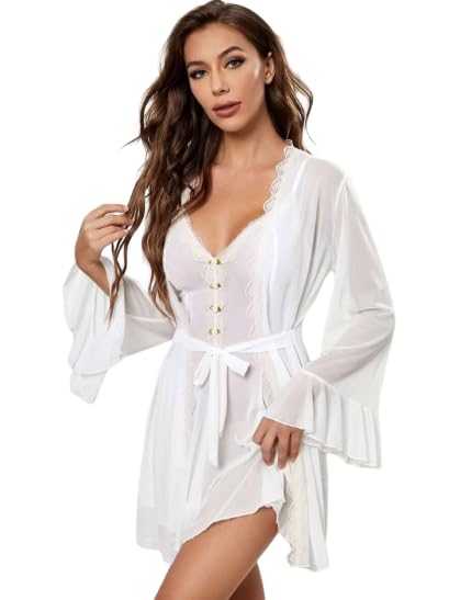 هنادي - طقم بيجامة بحزام واكمام مكشكشة من الدانتيل بلون متباين من هنادي - مقاس واحد - قماش تول ودانتيل