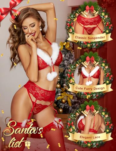 هنادي - ملابس داخلية مثيرة للكريسماس للنساء من هنادي، 3 قطع بيبي دول سانتا دانتيل مع حزام تعليق، مقاس واحد