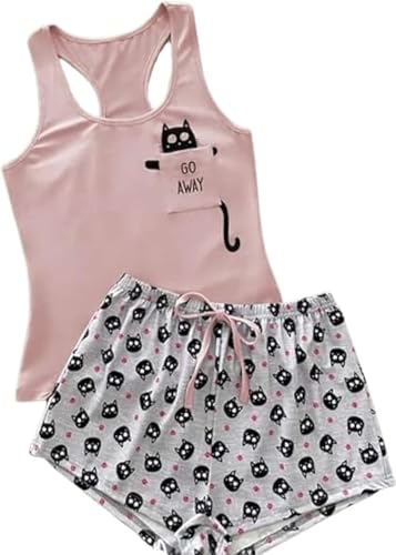 هنادي - طقم بيجامة بتصميم مطبوع بنمط قطة للنساء من هنادي - مقاس واحد - قماش قطن