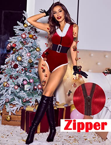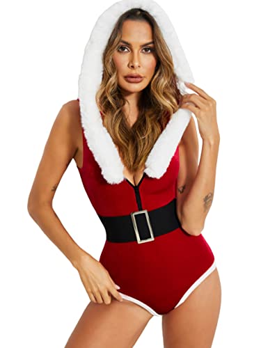 هنادي - ملابس داخلية للكريسماس للنساء من هانادي، بودي سوت تيدي بغطاء للراس مع حزام، قطن وبوليستر، أحمر