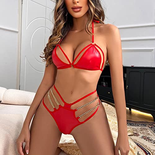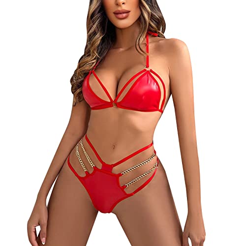هنادي - طقم لانجيري عصري للنساء من هانادي، عبوة من قطعتين من جلد البولي يوريثين مع سلسلة وحلقة مربوطة باليد، مثير للكريسماس، مقاس واحد