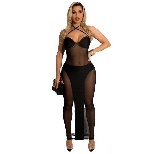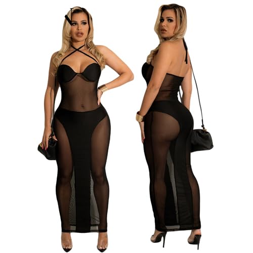 هنادي - فستان ضيق ماكسي مثير شفاف متقاطع بدون ظهر للنساء من هنادي - مقاس واحد - قماش تول