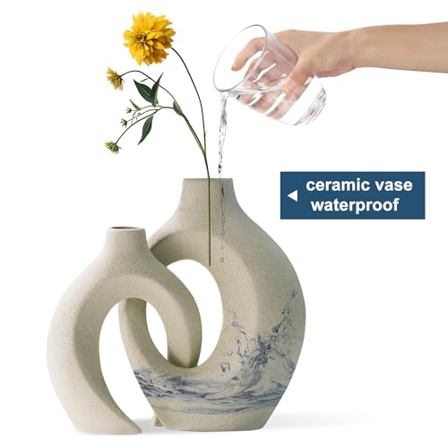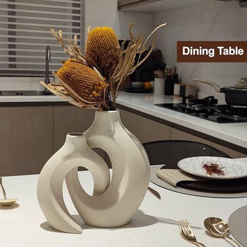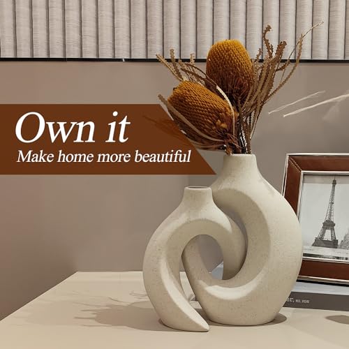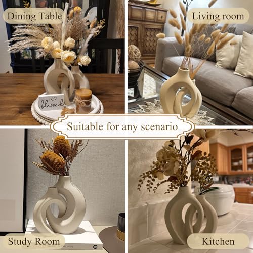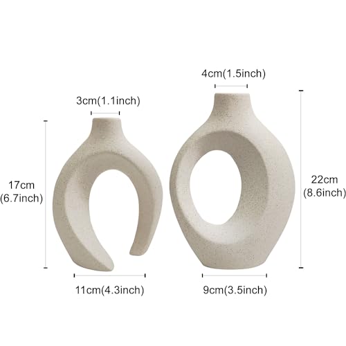 Hanaomaoyi - مجموعة فازة سيراميك مجوفة من هاناوماوي، بتصميم حديث دائري للديكور الاسكندنافي البسيط، وعلى شكل دونات بنمط بوهيمي للمنزل العصري وغرفة المعيشة الرئيسية وديكور طاولة المدخل، قطعتان (بيج)