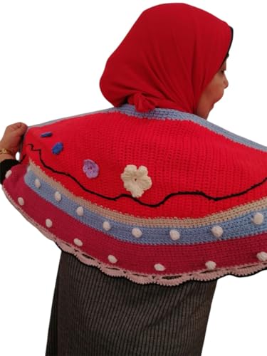 Generic - شال محبوك يدوياً، أحمر مع زخارف زهور، تصميم تقليدي بحواف ملونة، صوف تركي ناعم _ قطعه فريده صنعت بكل الحب لمحبي التميز والشياكه