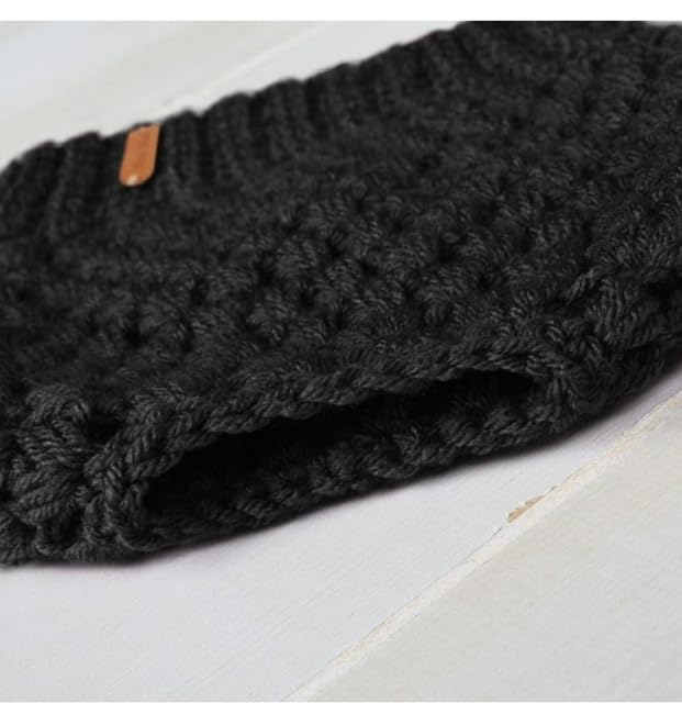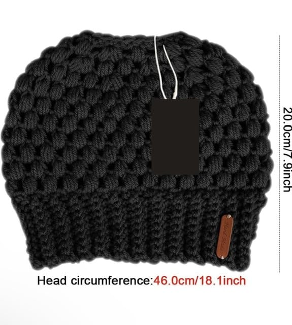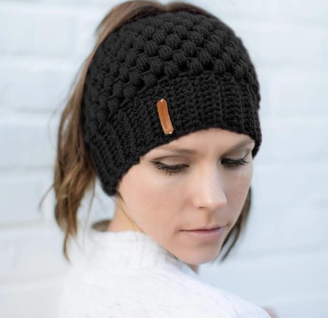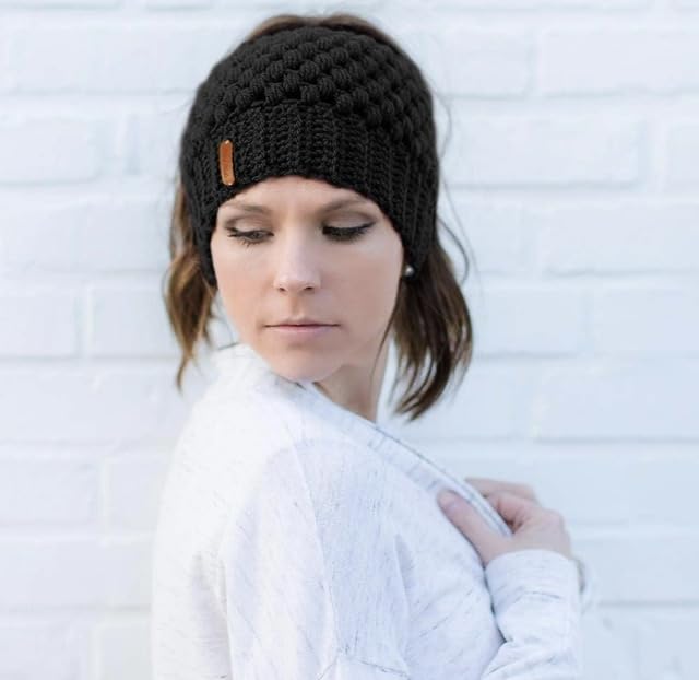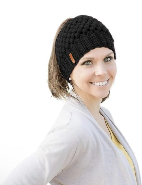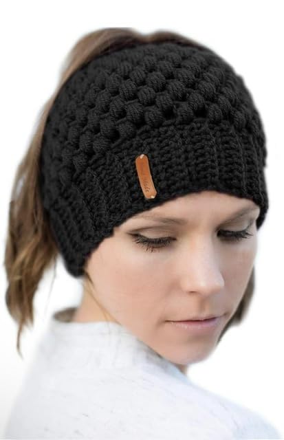 Generic - قبعة ذيل حصان شتوية مصنوعة يدويا مع فتحة مضفرة، قبعة ذيل الحصان، أسود، للنساء