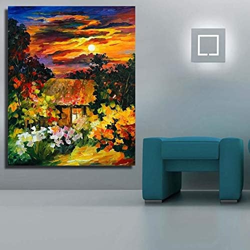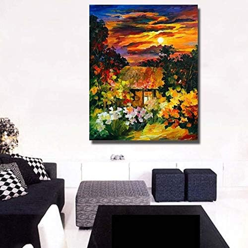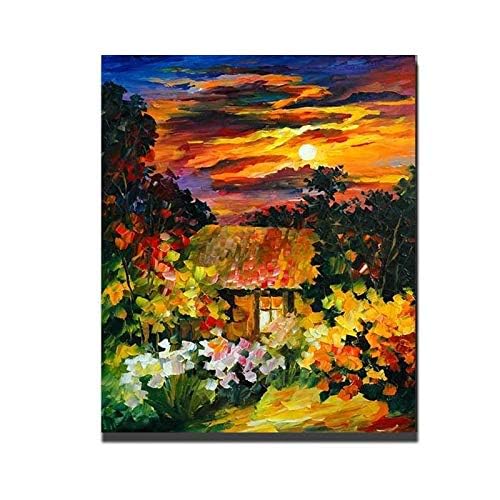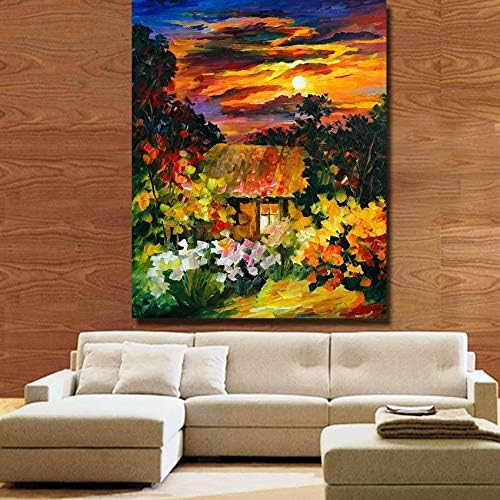 Other - لوحة زيتية مرسومة باليد على الحائط محاطة بالزهور والأشجار بدون إطار 70 × 100 سم، من اذر