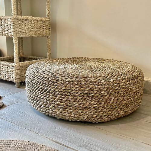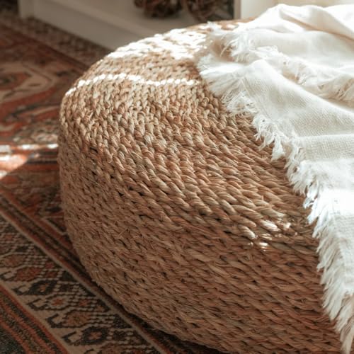 Generic - كنبة صغيرة مستديرة مصنوعة يدويًا من عشب الحلفا الطبيعي بتصميم عثماني وحافة بيضاء مزينة بشرابات، قطر 60 سم × ارتفاع 20 سم، ديكور منزلي بنمط بوهيمي