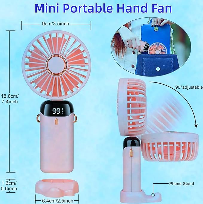- يمكن طي المروحة المحمولة باليد حتى 90 درجة. يمكنك حمل هذه المروحة الصغيرة على يدك، ووضع هذه المروحة الصغيرة المحمولة على الطاولة
