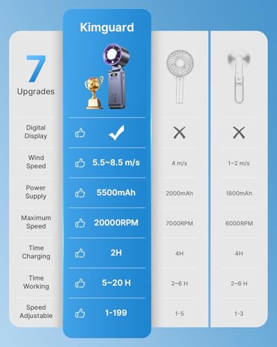 - تبريد فائق السرعة: يتميز بتصميم متطور من 7 شفرات مقترن بمحرك عالي السرعة بدون فرش ثلاثي المراحل، مما يوفر سرعة رياح قصوى تبلغ 8.5 متر/ثانية - أسرع مرتين من المراوح اليدوية التقليدية! مع أقصى سرعة تبلغ 20000 دورة في الدقيقة، فإنه ينفخ الحرارة على الفور، مما يبقيك باردًا ومرتاحًا طوال اليوم.
