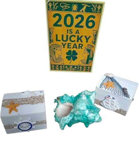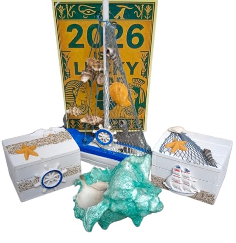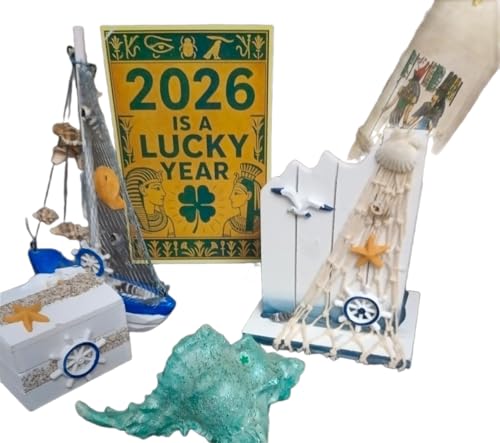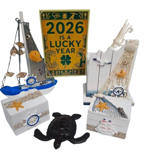- مجموعة ديكور شاطئ كاملة: تتضمن هذه المجموعة البحرية المصنوعة يدويًا نموذجين زخرفيين للقوارب الشراعية (15 × 10 سم)، تمثال سلحفاة (10 × 5 سم)، صندوقي تخزين صغيرين (5 × 5 × 6 سم)، صندوق عرض خشبي مفتوح (10 × 15 سم)، وصورة فرعونية بردية (20 × 30 سم)
