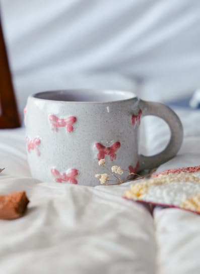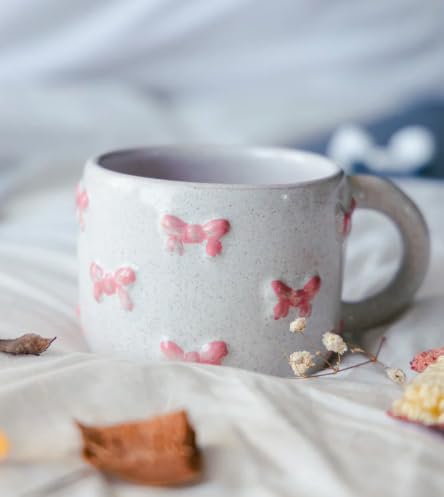 Generic - مج سيراميك مصنوع يدويًا بنمط فيونكة وردية، مج فخار بريميوم، سعة 200 ملليلتر، أبيض مع تصميم وردي